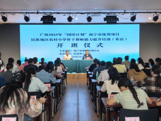 10月19日下午,广西2025年“国培计划”南宁市统筹项目——民族地区农村小学骨干教师能力提升培训(英语)在我校顺利开班。南宁市教师培训中心主任莫尧,桂林理工大学继续教育学院院长周国桥以及来自南宁市的150余位小学英语骨干教师参加了开班仪式。