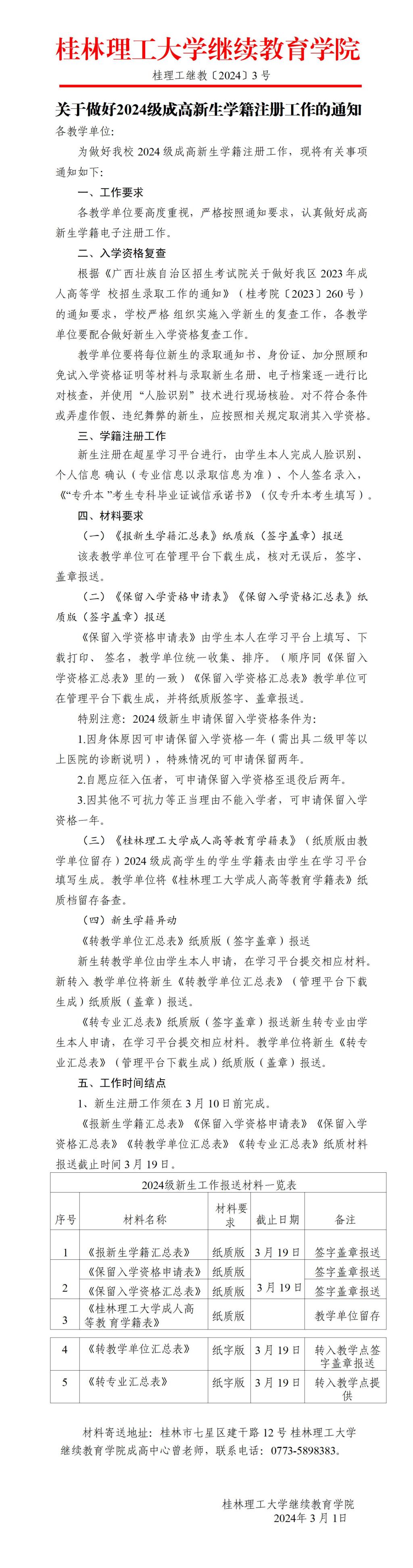 关于做好2024级成高新生学籍注册工作的通知 发布者:成高管理中心 2024-03-01 已阅人次 (一审:曾婕 二审:段伟才 三审:李衡) 上一条:关于对滕茂星等成人高等教育2024级新生按放弃入学资格处理的公示 下一条:桂林理工大学2024年新增高等学历继续教育校外教学点遴选结果的公示 关注我们